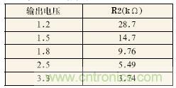 表1為當R1為10kΩ時,幾種輸出電壓下R2的推薦值。