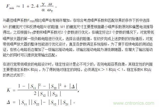 【導讀】本文給出了一種1 ~ 3 GHz 頻段的寬帶低噪聲放大器的設(shè)計,電路采用電阻負反饋結(jié)構(gòu),采用SMIC 0.18 μm RF CMOS 工藝對寬帶低噪聲放大器進行了優(yōu)化分析和仿真,結(jié)果表明在寬帶匹配、通道增益及噪聲系數(shù)方面都取得了較好的性能,對于寬帶低噪聲放大器的設(shè)計具有一定的參考價值。