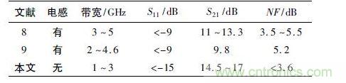 本文設(shè)計的寬帶低噪聲放大器與已經(jīng)發(fā)表文獻中的寬帶低噪聲放大器的性能比較如表1 所示,這些文獻均采用0. 18 μm 工藝進行設(shè)計,具有一定的比較意義。通過表1 可以看出,本設(shè)計中各項參數(shù)都達到了較好的性能指標,避免了傳統(tǒng)集成電路設(shè)計中需要采用電感的缺點,而電感通常在電路設(shè)計中占用非常大的面積,本文設(shè)計的寬帶低噪聲放大器省略了傳統(tǒng)低噪聲放大器設(shè)計中的電感,這將在很大程度上減少芯片的面積; 更為重要的是該芯片依靠自身的MOS 管和比例電阻實現(xiàn)了內(nèi)匹配,避免了大批量應用時由于芯片內(nèi)部參數(shù)受工藝參數(shù)影響而造成的外圍匹配電路的更改,簡化了芯片的應用,在實際的工程應用中具有重要的意義。
