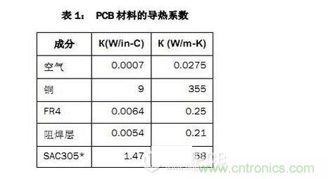 該PCB主要由FR4電路板材料和銅組成,另有少量焊料、鎳和金。表1列出了主要材料的導(dǎo)熱系數(shù)。