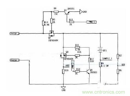 根據(jù)三路AD采樣結(jié)果確定充電器的充電狀態(tài)后,由單片機輸出兩路占空比可調(diào)頻率為1kHz的PWM波形PWM1和PWM2分別用來控制兩只三極管2N5551的導(dǎo)通程度,三極管集電極電流會隨著不同,再經(jīng)電阻分壓后提供不同的電壓給場效應(yīng)管的柵極,驅(qū)動MOSFET,輸出不停大小的漏極電流Id,給蓄電池提供大小不等的充電電流和放電脈沖幅值,最終達到脈沖充電的效果。