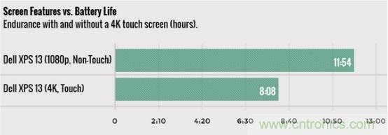 拋開電池技術(shù)本身止步不前的原因,筆記本電腦電池壽命沒有進(jìn)步的主要原因在于其他硬件發(fā)展。雖然處理器每一年都在功耗方面擁有一定進(jìn)步,但4K屏幕、觸摸屏、超輕薄設(shè)計(jì),對(duì)電池壽命都產(chǎn)生了消極的影響。以戴爾XPS 13為例,1080P非觸摸屏版本相比4K觸摸屏版本的電池壽命長了約4小時(shí)。