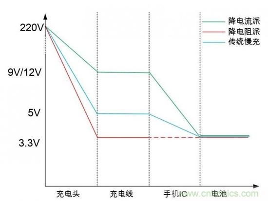 從電壓的角度來對比一下傳統慢充、降電阻快充技術與降電流快充技術,如下圖所示。