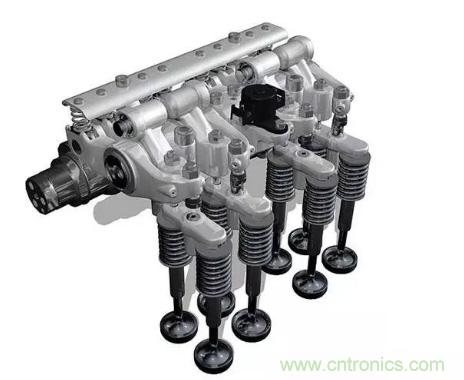 凸輪從動(dòng)件下方安裝一個(gè)橋接器,含有一個(gè)控制電磁閥來調(diào)節(jié)液壓油向液壓執(zhí)行機(jī)構(gòu)的流動(dòng),而作用位置是凸輪而不是常規(guī)的凸輪從動(dòng)件;液壓 油供應(yīng)來自于搖桿軸上的孔隙。動(dòng)力輸出條件下電磁閥關(guān)閉,執(zhí)行機(jī)構(gòu)活塞鎖定在橋接器上,使得排氣閥門跟隨凸輪完成正常四沖程運(yùn)動(dòng)。當(dāng)需要制動(dòng)的時(shí)候,電磁 閥開啟并與橋接器上執(zhí)行機(jī)構(gòu)脫離,排氣閥門依然處于關(guān)閉狀態(tài),直到氣缸活塞到達(dá)上止點(diǎn)位置。因?yàn)橥馆喺_\(yùn)轉(zhuǎn),而橋接器無法改變排氣閥舉升高度和時(shí)間長 短,所以制動(dòng)效應(yīng)不會給發(fā)動(dòng)機(jī)做功過程完整性造成麻煩。