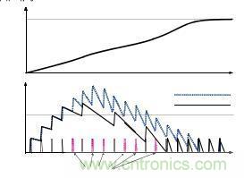 在啟動階段,若IDRAIN 在tONMIN時間內升至較高值,則脈沖跨周調制模式激活,以降低芯片的開關頻率(圖9),為電感提供更多的放電時間,幫助限制漏極峰流值,防止電流失控現象發生,避免變壓器出現飽和,提高系統總體可靠性。