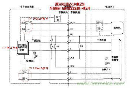 1)在充電過程中,非車載充電機控制裝置通過對檢測點1的電壓進行檢測,如果判斷開關S由閉合變為斷開(如充電槍上按鍵失靈或誤觸發等),應在50ms內將輸出電流降至5A或以下;