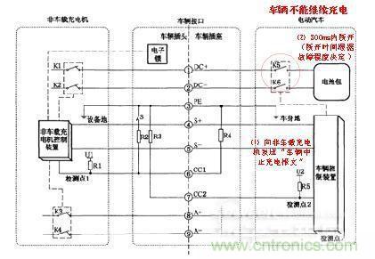 1)在充電過程中,如果車輛出現不能繼續充電的故障(如BMS系統誤報電池實時狀態、車輛控制裝置誤關斷充電回路接觸器等),則向非車載充電機發送“車輛中止充電報文”,并在300ms(由車輛根據故障嚴重程度決定)內斷開K5和K6。