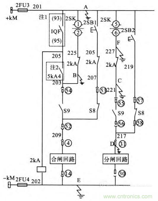 如上圖所示,直流接地故障發(fā)生在C、E兩點(diǎn),D、E兩點(diǎn),F(xiàn)、E兩點(diǎn)接地時(shí),分閘線圈被短接,保護(hù)動(dòng)作及操作時(shí)開關(guān)拒跳。同理,兩點(diǎn)接地開關(guān)也可能合不上,如B、E兩點(diǎn)接地時(shí)。