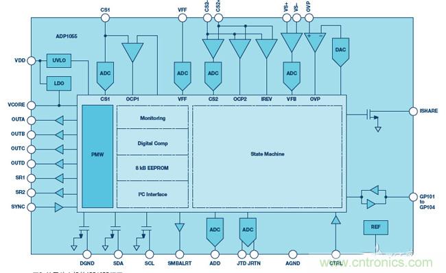 現在,存在許多基于狀態機的電源控制器。圖2中的ADP1055設計用于不同拓撲結構的直流隔離電源。但是,它還可用于采用交錯技術的負載點(POL)應用中。