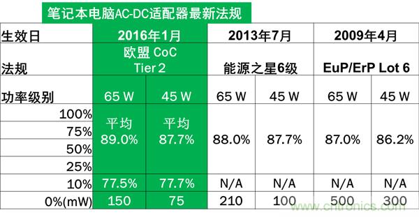 如于2016年1月1日生效的歐盟CoC V5 Tier 2 規定,輸出功率為45 W和65 W的AC-DC適配器平均能效需分別達到87.7%和89%,待機功耗分別低于75 mW和150 mW,并且還要求10%負載條件時的能效需分別達到77.7%和77.5%。電源設計工程師面臨體積、能效和成本等多方面的設計挑戰。