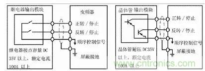 變頻器的輸入信號中包括對運(yùn)行/停止、正轉(zhuǎn)/反轉(zhuǎn)、微動等運(yùn)行狀態(tài)進(jìn)行操作的開關(guān)型指令信號。變頻器通常利用繼電器接點(diǎn)或具有繼電器接點(diǎn)開關(guān)特性的元器件(如晶體管)與PLC)相連,得到運(yùn)行狀態(tài)指令,如圖1所示。
