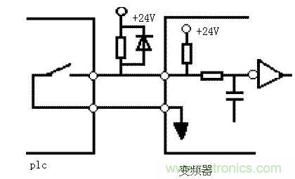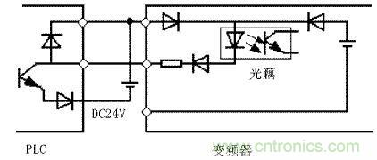當(dāng)輸入開關(guān)信號進(jìn)入變頻器時(shí),有時(shí)會發(fā)生外部電源和變頻器控制電源(DC24V)之間的串?dāng)_。正確的連接是利用PLC電源,將外部晶體管的集電極經(jīng)過二極管接到PLC。如圖4所示。