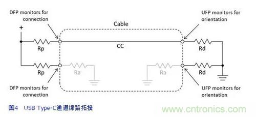 連接裝置之間的初始電力傳輸協(xié)議是透過一系列電阻器執(zhí)行,當(dāng)Type-C插頭插入插座時,這些電阻器充當(dāng)CC線路上的分壓器。由于插頭中的CC線路會連接至插座中的CC1或CC2,因此插座只要測量CC1和CC2線路上的電壓,即可判定插頭的方向。上拉電阻的不同數(shù)值可傳達(dá)電源能夠提供的電流量,同時可確定UFP和DFP分別是什么。電力消耗裝置沒有辦法透過不同的下拉電阻值指出其消耗的電流量,而是必須不斷地調(diào)整其負(fù)載以符合電源供應(yīng)器可提供的最大電流。