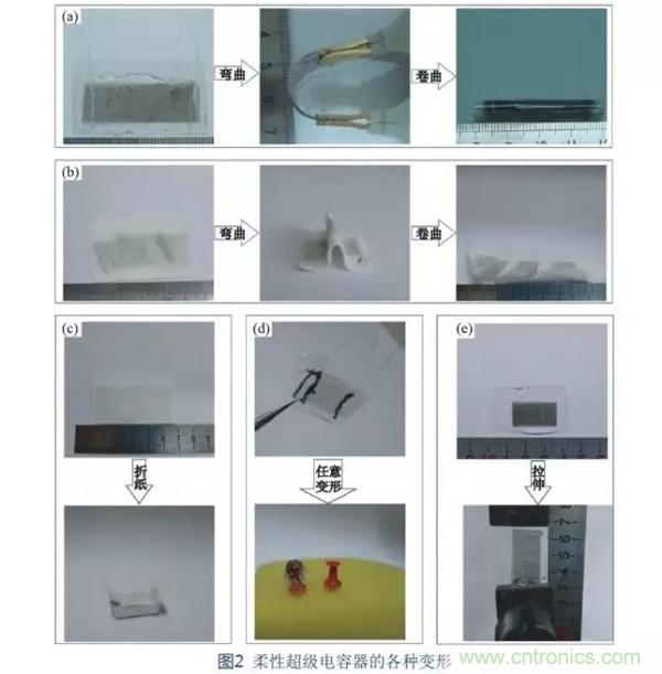 El-Kady等利用DVD光驅(qū)激光還原氧化石墨烯作為電極材料,制備所得柔性超級電容器的比電容達4 mF/cm2,并且具有優(yōu)異的變形性能。