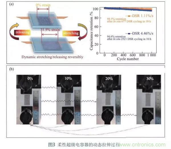 Zang等充分利用石墨烯網(wǎng)狀薄膜可與基底緊密結(jié)合的特點,獲得以預(yù)拉伸后的褶皺PDMS為基底、石墨烯網(wǎng)狀薄膜為電極材料的可動態(tài)拉伸(彎曲)超級電容器。動態(tài)拉伸(彎曲)頻率可高達60%/s。拉伸過程通過CV曲線進行實時檢測,結(jié)果表明,動態(tài)拉伸(彎曲)過程中未見明顯的性能破壞,具有很好的動態(tài)變形性能。