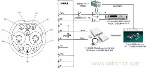 · K5、K6控制單元:驅動上述繼電器,與協議模擬器配合,在充電過程進入充電配置階段時實現繼電器吸合,進而使充電樁檢測到模擬電池電壓。本文推薦選擇致遠電子的NDAM-9000與NDAM-2808組成的控制單元,可以通過網口與CANScope實現聯動。