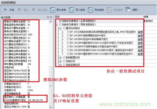· 啟動CANScope對應的充電樁協議一致性測試軟件ChargerBMS_Tester,選擇BMS仿真測試,配置相應信息主要包括模擬的BMS參數、K5、K6控制單元使能及IP地址設置。