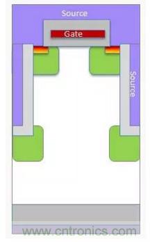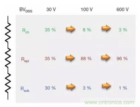 圖2顯示平面式MOSFET情況下構成RDS(on) 的各個分量。對于低壓MOSFET,三個分量是相似的。但隨著額定電壓增加,外延層需要更厚和更輕摻雜,以阻斷高壓。額定電壓每增加一倍,維持相同的RDS(on)所需的面積就增加為原來的五倍以上。對于額定電壓為600V的MOSFET,超過95%的電阻來自外延層。顯然,要想顯著減小RDS(on)的值,就需要找到一種對漂移區進行重摻雜的方法,并大幅減小epi電阻。