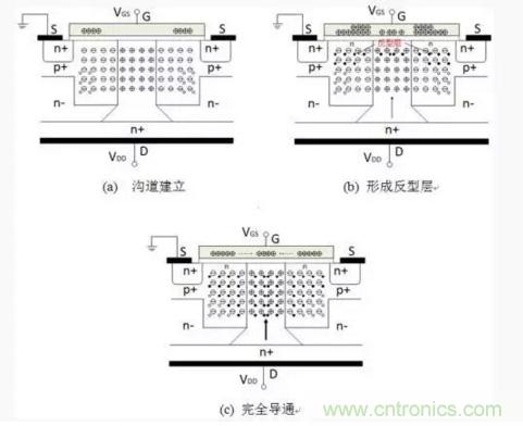 當MOS導通時,柵極和源極的電場將柵極下的P區反型,在柵極下面的P區產生N型導電溝道,同時,源極區的電子通過導電溝道進入垂直的N+區,中和N+區的正電荷空穴,從而恢復被耗盡的N+型特性,因此導電溝道形成,垂直N+區摻雜濃度高,具有較低的電阻率,因此導通電阻低。
