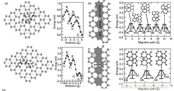 在鋰離子電池系統(tǒng)中,石墨烯除能夠存儲Li之外,還有一個重要的考察因素是石墨烯對Li離子擴(kuò)散過程的影響,這直接影響鋰離子電池的快速充放電行為。擴(kuò)散過程包括兩方面,Li在石墨烯表面上并以與表面平行的方向進(jìn)行擴(kuò)散,另外一種是穿過石墨烯平面,以與平面垂直的方向擴(kuò)散。