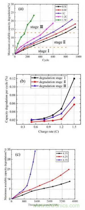 從數(shù)據(jù)可以看到,隨著充電的倍率的加大,鋰離子電池的衰降速率也在快速增加,并且從曲線的斜率來看,電池的衰降速度存在三個不同的階段,前期衰降速度較快的階段(階段1),中間衰降速度較慢的穩(wěn)定階段(階段2),和后期的衰降速率加速階段(階段3)。針對三個階段電池的衰降機理的研究認(rèn)為,階段1可能是因為電池SEI膜生長需要消耗一部分Li+,因此衰降速度較快。在階段2隨著SEI膜結(jié)構(gòu)的穩(wěn)定,內(nèi)部較為穩(wěn)定,因此衰降速度較慢,在階段3隨著電池老化,開始發(fā)生活性物質(zhì)損失,電極活性界面減少,導(dǎo)致電池對于電流十分敏感。圖C是針對不同的截止電壓對電池衰降速度影響的實驗,從實驗結(jié)果可以看到,當(dāng)把充電截止電壓提高到4.3V時會導(dǎo)致電池的循環(huán)性能急劇惡化,降低充電截止電壓可以有效的改善電池的循環(huán)性能。