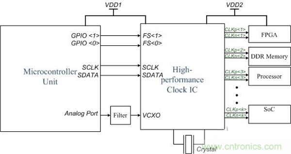 作為 I2C 主設備,微控制器將配置寫入時鐘 IC 的內部易失性存儲器并控制 PLL。因此,通過板載 MCU-IC 組合可以實現系統時鐘頻率的動態更新。開發人員可以使用可編程微控制器,為高性能時鐘 IC 提供控制邏輯。這可以減少對板載 IC 和走線數量的需求,使得整個系統設計更加緊湊。
