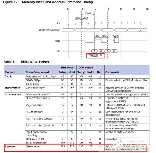 下面我們通過具體實例來看看時序的計算,下圖是Freescale MPC8572 DDR主控芯片手冊,這張圖片定義了從芯片出來的時候,DQS與DQ之間的相位關系。