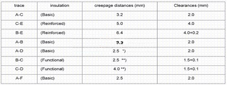 對于電路中各位置對大地,即交流輸入LN對地,整流后高壓直流對大地,原邊地對大地,副邊對大地等,全部需要采用基本絕緣;對于一次DC-DC線路內部器件,由于不存在電擊風險,只需要采用功能絕緣,保證電路正常工作,降低擊穿、打火風險;而對于一次電路對二次電路,如圖中BC對E,必須要采用加強絕緣,防止人員在接觸到二次電路時,具有危險性的一次電路造成電擊。