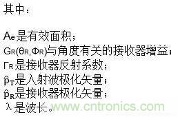 其中: PT是發射功率; r是天線范圍或距離; ΓT是發射器反射系數; GT(θT,ΦT)是與角度有關的發射器增益。