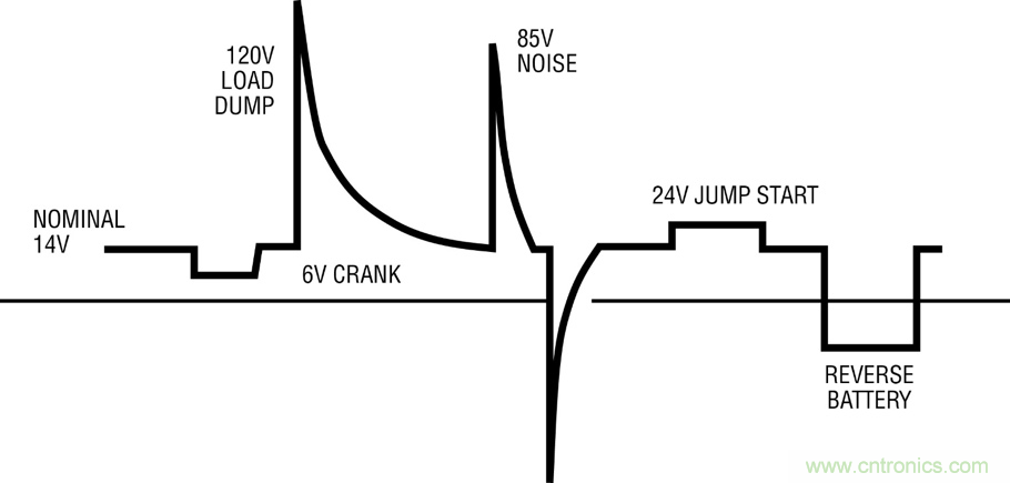 交通運輸系統的輸入電壓可能高達 14V (單電池供電汽車)、28V (雙電池供電卡車、客車和飛機)、或更高電壓,而其數字系統需要一個或更多個低壓軌。因此,設計這類系統時,需要了解怎樣才能簡便、高效和可靠地從很高的輸入電壓降壓。以下圖 1 顯示,汽車環境中的輸入電壓可能視其運行狀態的改變而改變,而其運行狀態可能包括負載突降變化到冷車發動的各種情況,甚至出現電池反向連接。