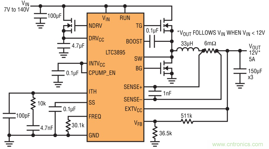 由于在單電池或雙電池供電車輛中,冷車發動和負載突降情況很常見,所以很多交通運輸系統都提供很寬的輸入電壓范圍。而且使情況更加復雜的是,所需輸出電壓有可能超出這種已經很寬的輸入電壓范圍。因此,系統設計師面臨的復雜問題是,無論輸入電壓是高于、低于還是等于輸出電壓,所設計的解決方案都必須允許固定輸出。