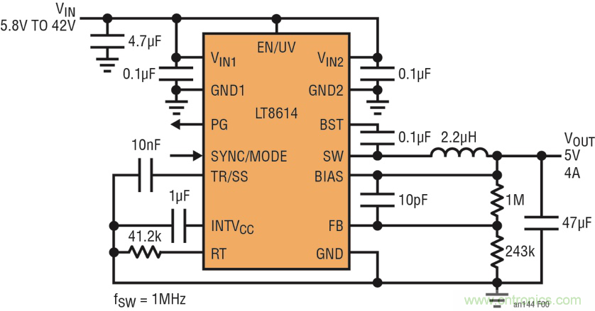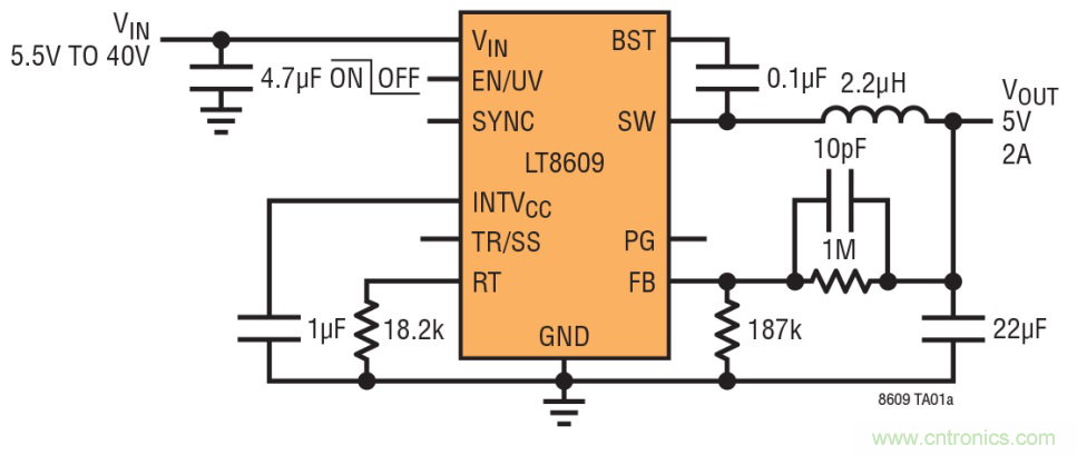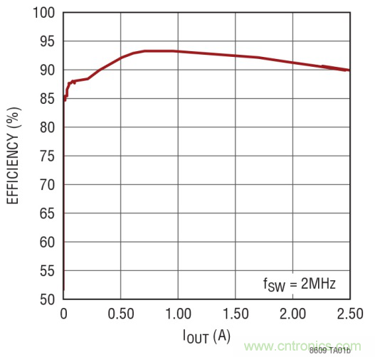 一個很好的例子是 LT8609,這是一款 2A、42V 輸入同步降壓型開關穩壓器。獨特的同步整流拓撲提供 93% 的效率,而以 2MHz 頻率切換使設計師能夠避開關鍵噪聲敏感頻段,例如 AM 無線電,同時可提供占板面積非常緊湊的解決方案。突發模式 (Burst Mode®) 運行在無負載備用情況下保持靜態電流低于 2.5μA,從而使該器件非常適合始終保持接通的系統。LT8609 的 3.0V 至 42V 輸入電壓范圍使其非常適合汽車應用,這類應用必須以低至 3.0V 的最低輸入電壓穩定通過冷車發動和停-啟情況,并穩定通過超過 40V 的負載瞬態。其內部 3.5A 開關可在峰值負載電流為 3A 時,提供高達 2A 的連續輸出電流。原理圖和相應于 2MHz 切換頻率的效率曲線如圖 3 所示。