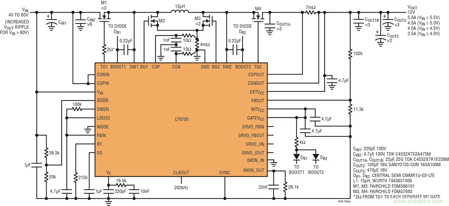 圖 4:詳細的 LT8705 原理圖,從 4V 至 80V 輸入提供固定 12V 輸出