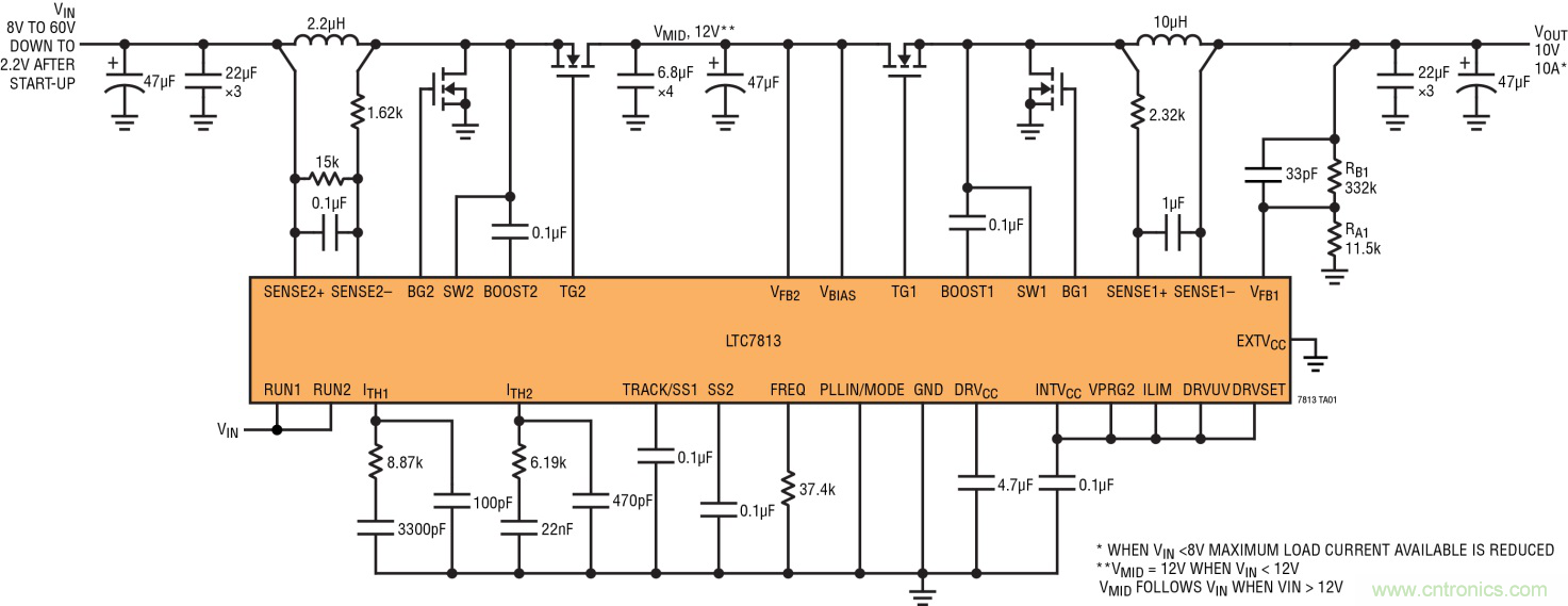 解決汽車冷車發動問題的另一種方法是,采用升壓型轉換器,后面再跟一個降壓型轉換器。在這種拓撲中,從單電池提供的升壓型轉換器之輸出設定為比電池的標稱電壓高出幾伏,然后再用一個降壓型轉換器對其降壓,使其達到下游電子組件所需的工作電壓。盡管這種方法需要兩個轉換器,但是ADI公司已經開發出一款整合了升壓型控制器和降壓型控制器的器件,兩個控制器既可獨立使用,又可作為升壓-降壓跟隨器使用。圖 5 中用LTC7813 說明這種器件的工作原理。