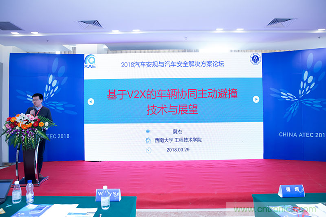 西南大學(xué)汽車電子專家冀杰博士在論壇上做了車規(guī)與基于V2X的車輛協(xié)同主動避撞技術(shù)展望的大會報告。