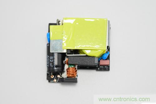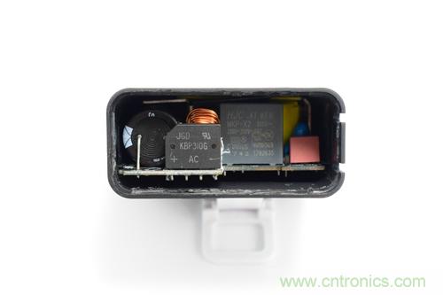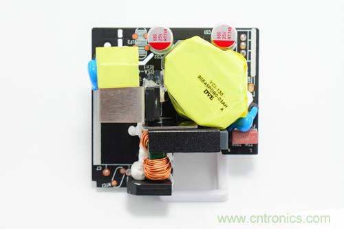 元件面頂視圖一覽,可見兩片貼有黃色絕緣膠帶的散熱片,整個PCB呈“L”形,缺口處用于放置AC折疊插頭組件。