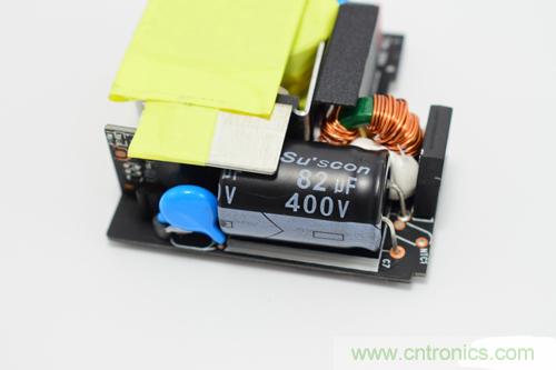 全橋整流后的一次側濾波電源為一枚82μF/400V 電容,來自SUSCON(臺灣冠坤)。從此角度看,屬于保護電路的NTC空缺未安裝。