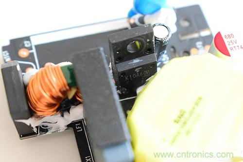 另一片散熱片上的共陰肖特基對管,標記比較淺和模糊,印字為 LT 7B37 G40H100CTW。這枚肖特基對管用于二次側DC整流,該電源并沒有采用目前已經廣泛使用的SR方案。