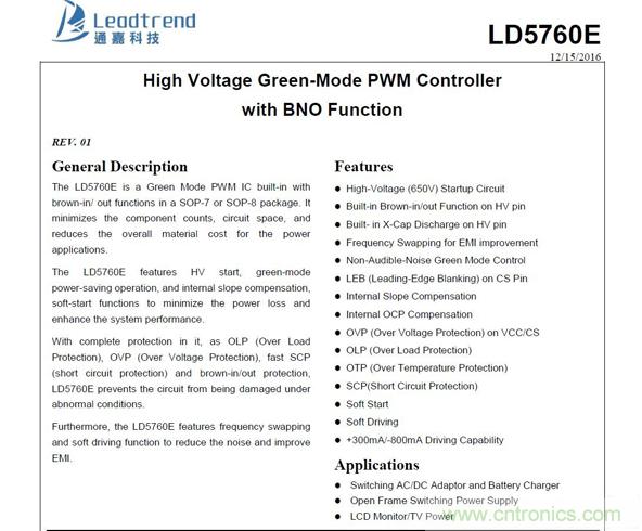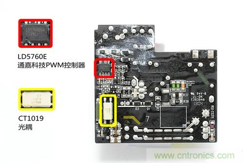 由于沒有使用SR技術,PCB背面元器件較少,主要是位于左上的 LD5760E,來自通嘉科技的PWM控制器,與前述的東芝TK10A60W組成一次側電路。左下方的白色器件為CT1019光耦,用于電壓反饋。