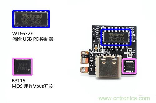 14腳IC為 Weltrend偉詮WT6632F ,來自偉詮的 USB PD控制器,同時支持QC2.0和QC3.0協議。粉色框內是絲印為 B3115 的貼片MOSFET,用于Vbus開關。