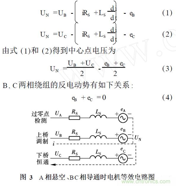 1) 反電動勢法通過檢測端電壓獲得反電動勢過零點,設置延遲時間得到換相點. 本文采用軟件算法獲得過零點和換相點, 簡化了硬件電路, 適用于低成本應用.
