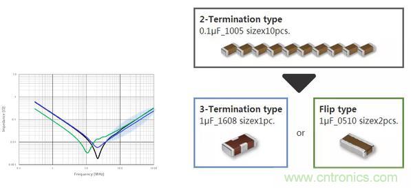 為了抑制電壓波動,需要降低阻抗。此處將介紹為了在基板尺寸以及貼裝區(qū)域等受到嚴(yán)格限制的情況下實現(xiàn)所需要的阻抗特性,TDK所提出的通過替換為低ESL產(chǎn)品來減少去耦電容數(shù)量的方案。