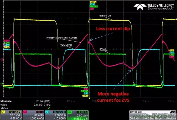 (6)、有源箝位反激變換器使用GaN同時采用次級同步整流,在原邊和次級繞組換流過程中,變壓器的原邊電流下跌凹坑更大,因此可以減小上管的導通損耗以及變壓器原邊繞組的導通損耗,從而提高效率。