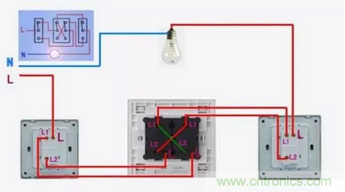 有的朋友說中間可不可以用雙聯雙控開關,也是可以的。不過雙聯開關上有兩個開關,需用同時按下。