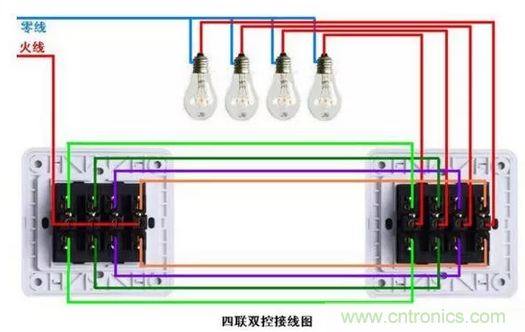 第一個是兩個四聯雙控同時控制四個燈,第二個圖是一個四聯雙控加四個單聯雙控。四控可以理解為總開關,其他四個開關又可以單獨控制。