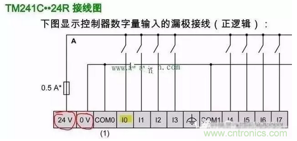 如圖三所示,這是PLC 的硬件手冊(cè),我們要想把接近開關(guān)的信號(hào)接到輸入點(diǎn)I0上,也就是黃色熒光筆部分,該怎么辦呢?其實(shí)很簡(jiǎn)單,看紅色圓圈的部分,PLC已經(jīng)為我們提供了輸出電源,我們只需把接近開關(guān)的三根線依次接上即可