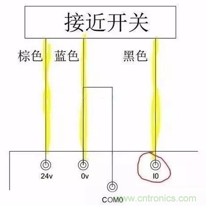 如圖三所示,這是PLC 的實(shí)際接線,黃色熒光筆標(biāo)識(shí)的是接近開關(guān)的三根接線,棕色和藍(lán)色分別接到PLC 的24V和0V上,黑色接到I0上。當(dāng)有物體到達(dá)接近開關(guān)的感應(yīng)距離時(shí),PLC的I0便會(huì)有輸入,我們?cè)诔绦蚶锞涂梢宰鎏幚怼P枰⒁獾氖牵瑘D中0V和COM0短接,因此,這種接法適合PNP型的接近開關(guān)。而NPN型的接近開關(guān)按此接法,是不會(huì)有任何信號(hào)的。接近開關(guān)的接線只和NPN,PNP類型有關(guān)和感性 容性無任何關(guān)系。