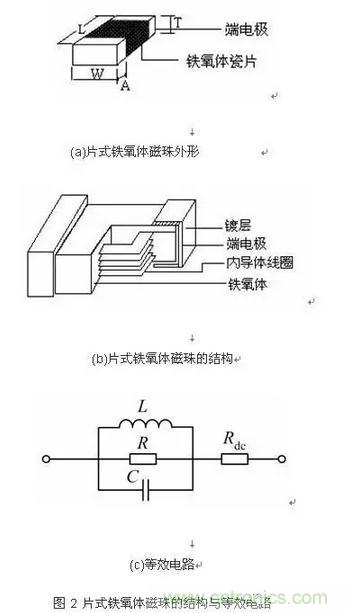 片式磁珠是目前應(yīng)用、發(fā)展很快的一種抗干擾元件,廉價、易用,濾除高頻噪聲效果顯著。片式磁珠由軟磁鐵氧體材料組成,片式鐵氧體磁珠的結(jié)構(gòu)和等效電路如圖2所示,實(shí)質(zhì)上它就是1個疊層型片式電感器,是由鐵氧體磁性材料與導(dǎo)體線圈組成的疊層型獨(dú)石結(jié)構(gòu)。由于在高溫下燒結(jié)而成,因而具有致密性好、可靠性高等優(yōu)點(diǎn)。兩端的電極由銀/鎳/焊錫3層構(gòu)成,可滿足再流焊和波峰焊的要求。在圖2所示的等效電路中,R代表由于鐵氧體材料的損耗(主要是磁損耗)以及導(dǎo)體線圈的歐盟損耗而引起的等效電阻,C是導(dǎo)體線圈的寄生電容。