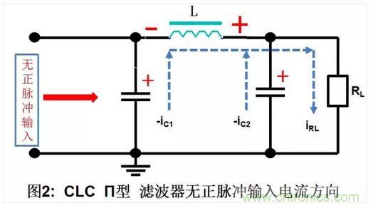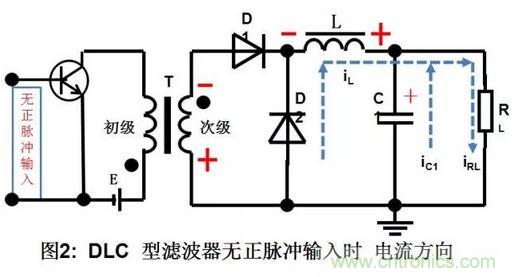 b. 輸入正脈沖消失,負(fù)載RL的電流由兩路提供,一路是C2放電提供的電流為-ic2,,另一路是由電感L儲(chǔ)存的磁能轉(zhuǎn)換成電能,并與C1上的電壓串聯(lián)后提供-ic1。負(fù)載RL中的電流等于兩個(gè)電容器放電電流的和,即IL= -(ic2+ic1)