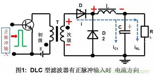 a.輸入正脈沖時(shí),先給C1充電,充電電流為ic1,迅速充到脈沖的峰值電壓Vi,同時(shí)電感器L中也有線性增長(zhǎng)的電流,并在L中儲(chǔ)存了磁能,隨著電流的增長(zhǎng),儲(chǔ)存的磁能越來越多,電容器C2通過電感L也充上了電壓,充電電流為ic2,C2和C1上的電壓基本相等,負(fù)載RL中的電流IRL也是由輸入脈沖供給。